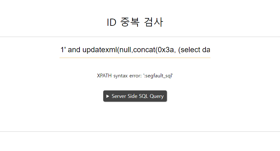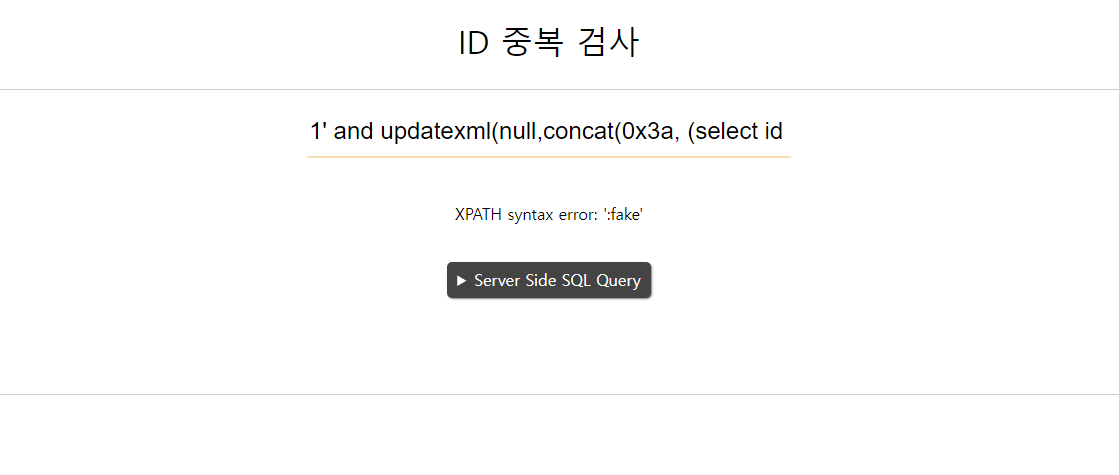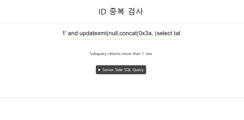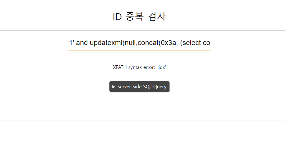 1' and updatexml(null,concat(0x3a, 'test'),null) and '1'='1 # 값이 잘 나오면 아래 구문으로 다시 시도